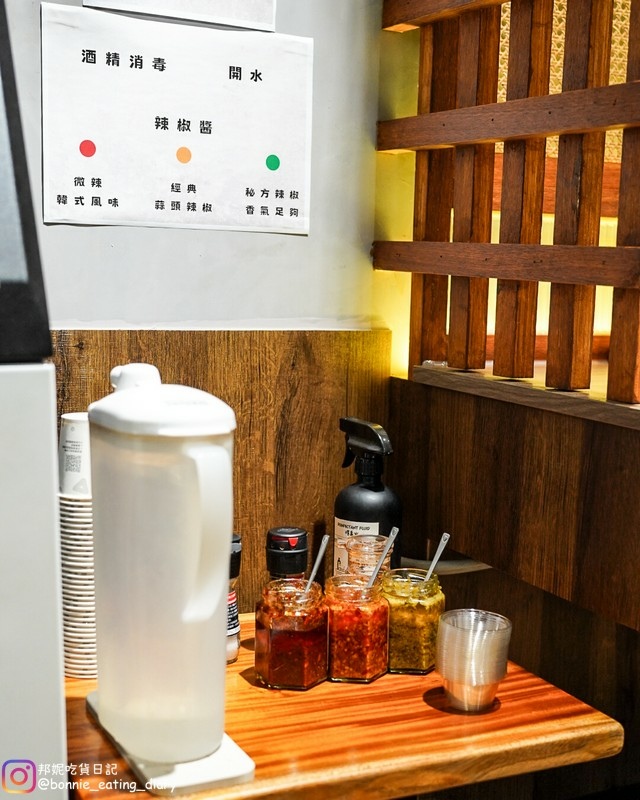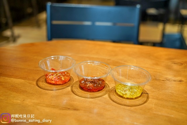 自助區有開水可以自取, 比較特別的是提供三種不同的辣椒醬