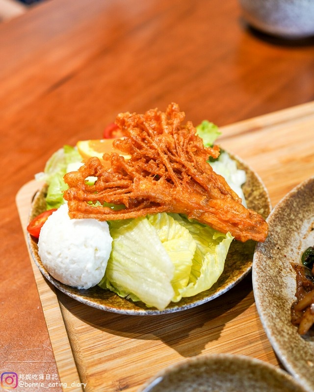 以定食來說非常有份量的沙拉,生菜非常新鮮,附上胡麻醬可以沾,旁邊還有沙拉馬鈴薯泥跟水果,最上面的炸金珍菇好吃又漂亮