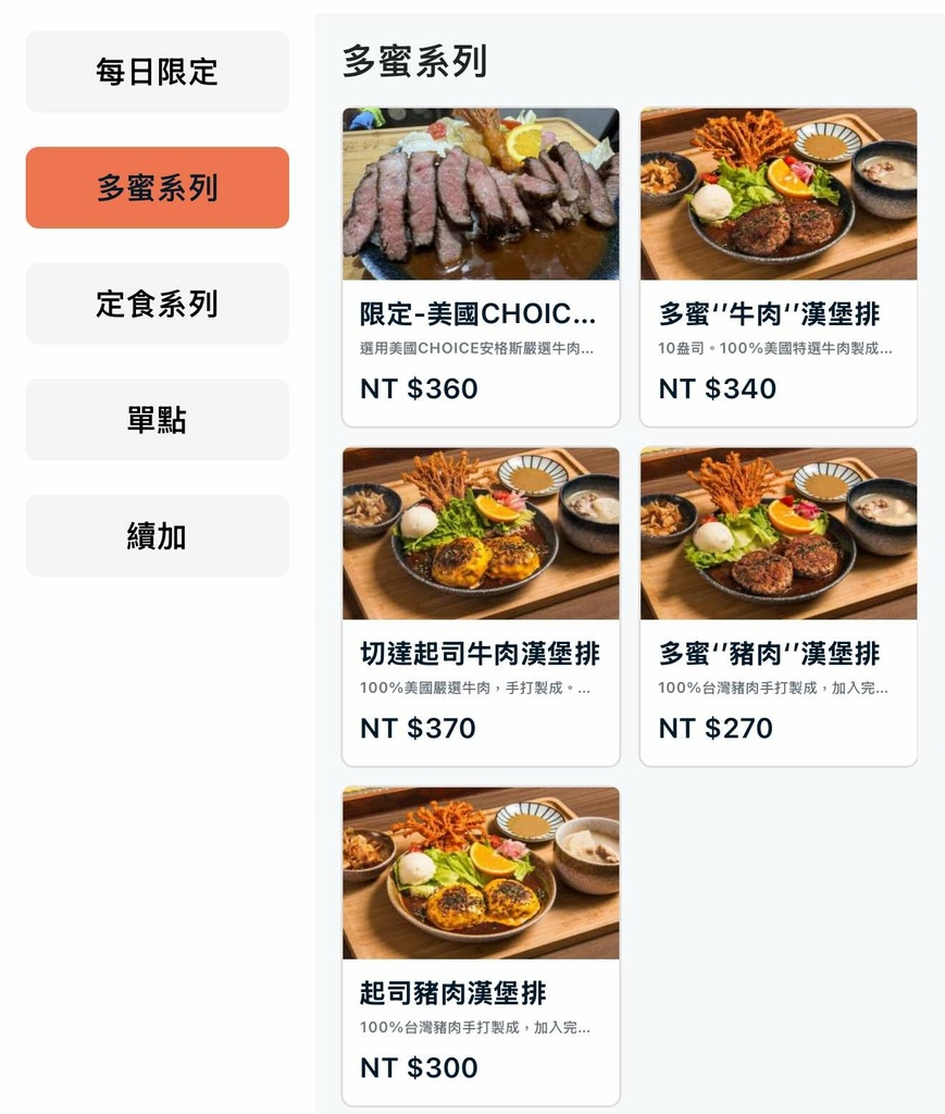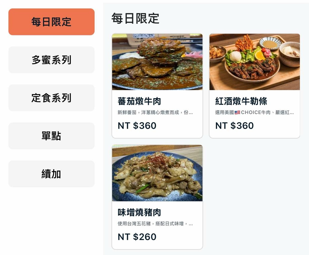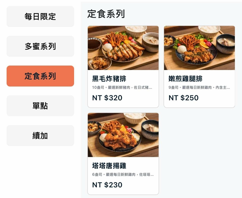 餐點的部分非常多元, 有各式定食也有套餐可以加購, 有些餐點是每日限量
