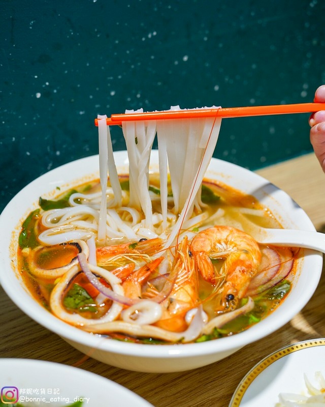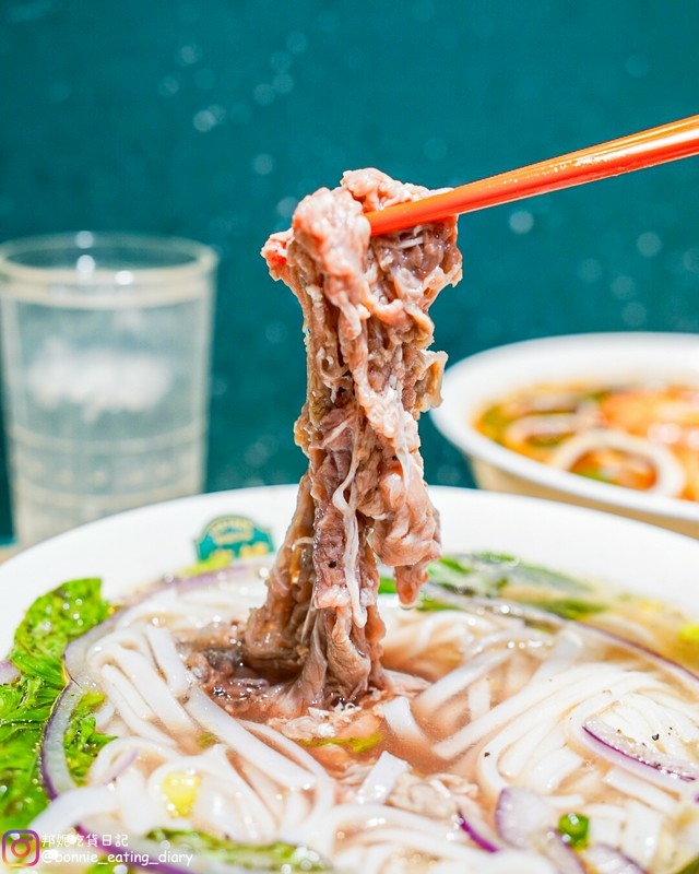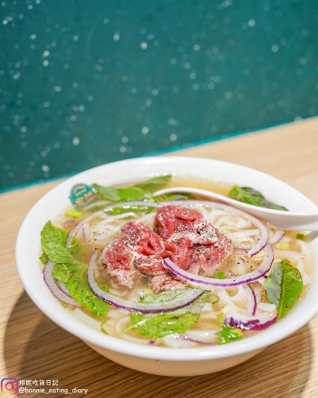 現燙的生牛肉河粉,直接把生牛肉加進高湯中,建議上桌就要趕快現吃會更讚,湯頭不會太厚重,吃得到明顯的九層塔味,如果想要湯頭更鮮甜可以自己添加魚露, 河粉的份量不少,口感也很Q彈