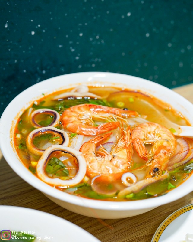 海鮮河粉的湯頭跟生牛肉河粉一樣,但多了一個海鮮的鮮甜味,配料有三隻蝦子跟三個魷魚圈,喜歡海鮮的人的好選擇